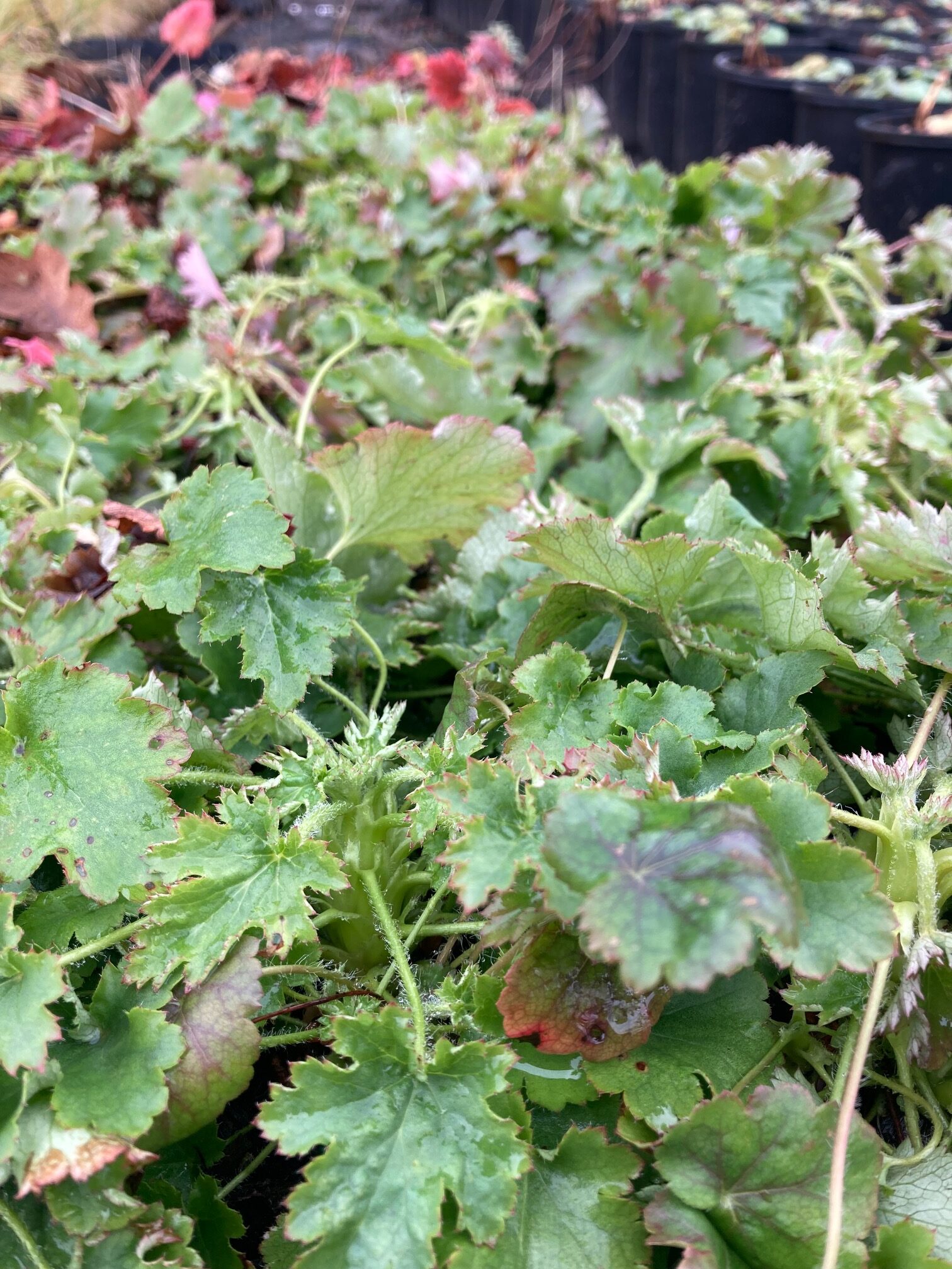Habit: green to greenish red evergreen leaves are mostly basal. Leaves are rounded to heart shaped with 3-7 shallow lobes and margins that are soft to sharp toothed. The leaf stem is long and hairy. Red flower stems rise about 12 in (30 cm) above the leafy clump. The flowers are open and large comprised of many small delicate whitish green flowers. Flowers bloom between May and August, depending on elevation.