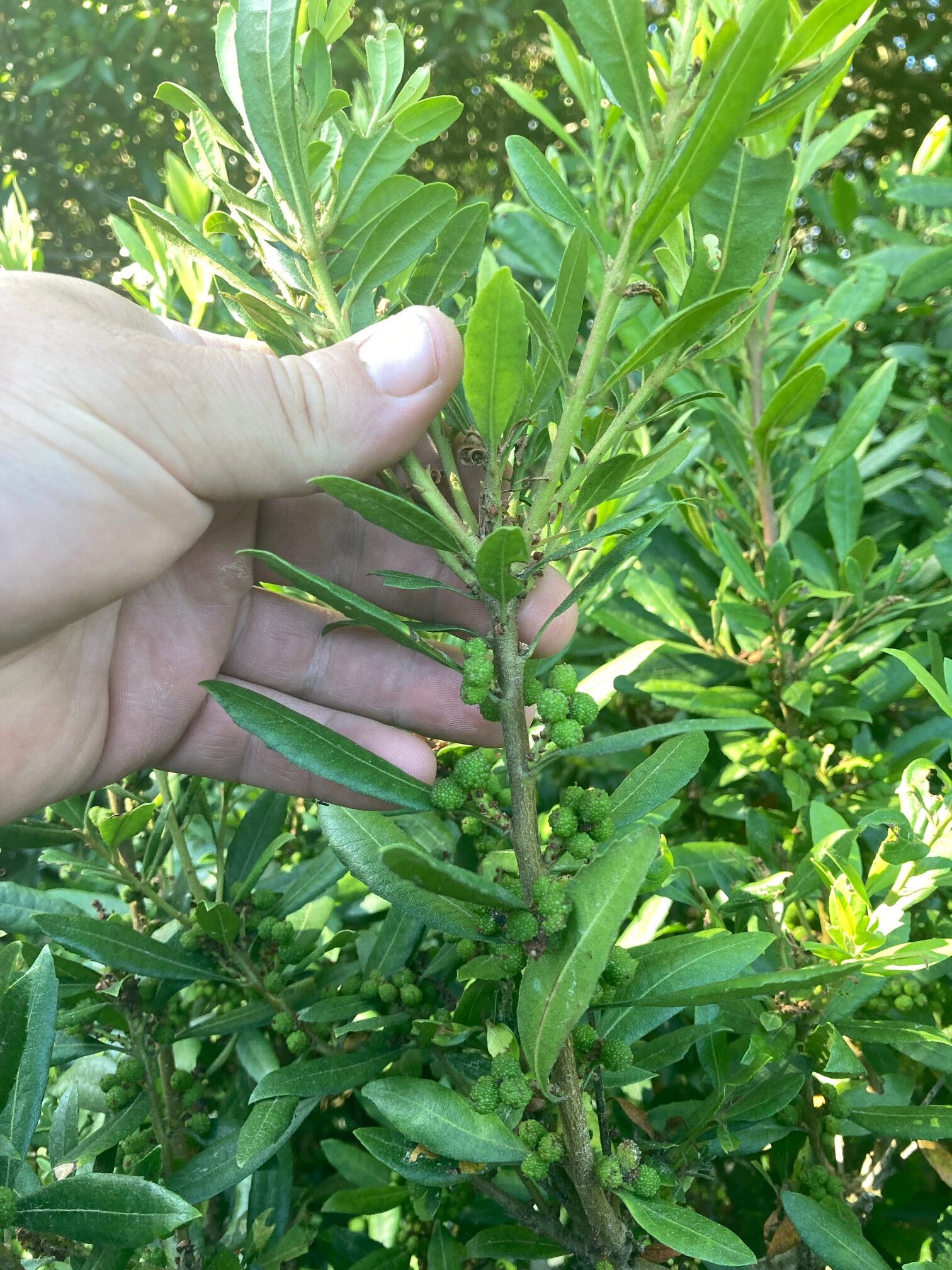 Habit: densely branched, multi-stemmed shrub but when protected it forms into a small tree with a narrow rounded crown. The gray to brown bark is smooth and thick, leathery evergreen leaves are elongated with serrated margins often having resin dots. The sticky leaves give off a spicy aroma when crushed or on a warm day. Male flowers are tiny yellowish green catkins, female flowers are tiny reddish green flowers both forming out of the leaf axils. The fruit is a single seeded, wrinkled berry in small tight clusters that are coated with a waxy white covering, turning from red to black, showier than the flowers. Blooms from April through July.
