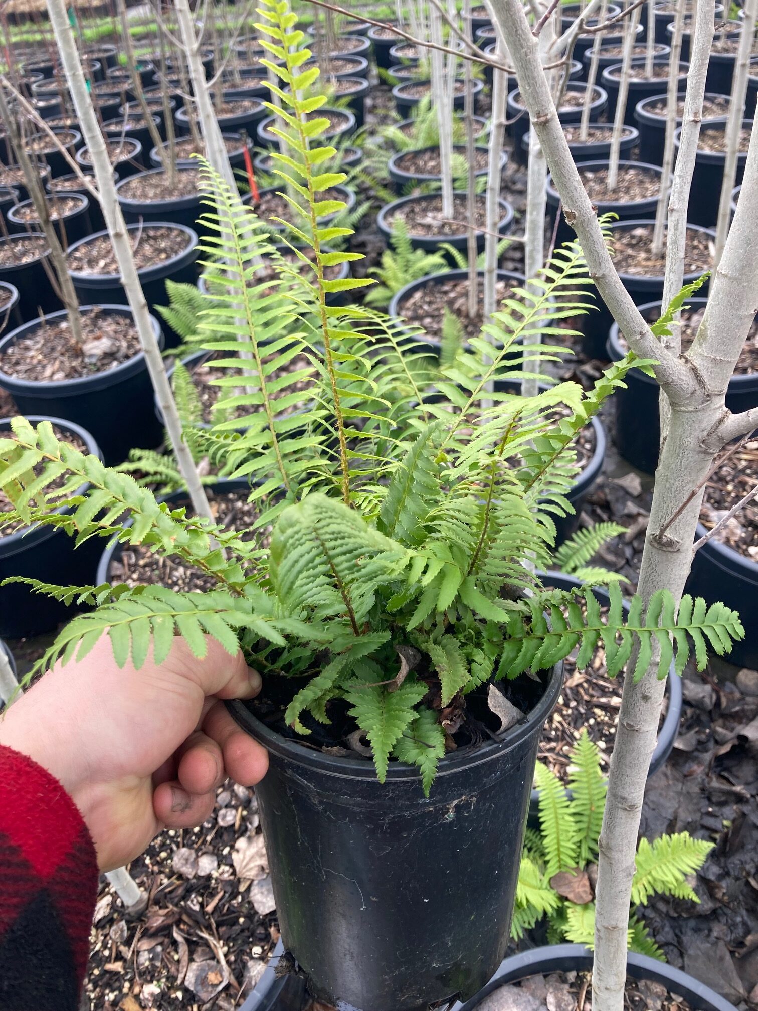 Habit: evergreen fern sprouting in a tight clump from large woody underground rhizomes. Upright, dark green compund leaves are divided once pinnately with serrated edges and bristly tips. Two rows of reproductive sori (cluster structures producing and containing spores) are found on the underside of fertile fronds and produce light yellow spores.